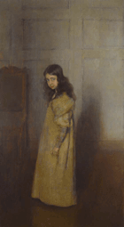 Dans le cadre immédiatement voisin du sien, sur le même fond de somptueuses et froides boiseries, une étrange petite fille, très grande pour ses six ans, ouvrait dans un visage d’enfant peureuse et triste, les mêmes larges prunelles transparentes et bleues, les mêmes yeux d’eau hagards et suppliants. Cela devenait hallucinant, je connaissais aussi ses yeux là et j’avais vu cet enfant quelque part ; le costume, il est vrai, dérangeait et déroulait un peu mes souvenirs ; la gaine de soie jaune dont on l’avait affublée, une lumineuse robe d’or toute droite qui en faisait une royale petite Infante, l’arrangement de ses boucles brunes auréolant son jeune front me mettaient moins à l’aise que le portrait de la mère ; car la frêle dame en vert était, certes la mère de cette jolie enfant. Leurs regards vivaient trop de la même souffrance, de la même impression d’inquiétude et de tendresse ardente dans le même bleu de bleuet ; et, ce qui me frappait surtout dans cet enfant, c’est cette façon déjà observée d’ailleurs chez une autre petite fille, où, et quand rencontrée ? de tenir la tête inclinée sur l’épaule ; cette timidité d’attitude, cet effarement un peu craintif de petite âme précoce en arrêt devant la vie et qui se replie frileusement, cet air, comme je l’avais baptisé autrefois chez une autre, de petit oiseau tombé du nid.
