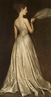 Dans Madame Gautreau, née Virginie Avegno, 1898 – Antonio de La Gandara – [Frick Collections, New York] on lit : (…) Antonio de La Gandara termine le portrait de Madame Gautreau dans une toilette de satin couleur crème et tenant une plume d’autruche avec laquelle elle s’évente.